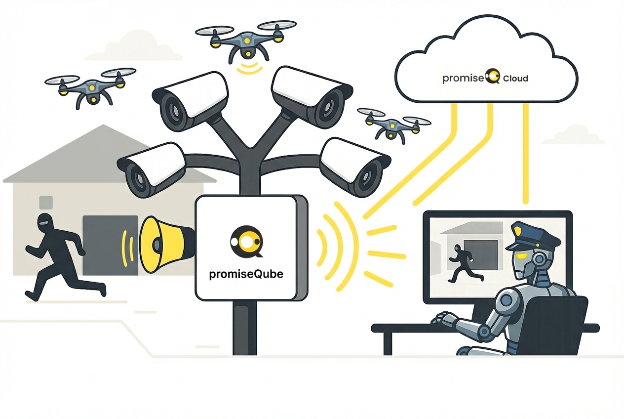 The promiseQube is a compact AI-powered device that transforms any surveillance setup into an autonomous security system. With real-time detection and deep analytics running directly on the edge, it detects suspicious activity and autonomously takes actions.